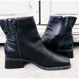 Easy Spirit Rouget Black Leather Square Toe Side Zip Low Heel Booties - Size 6.5