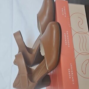 Chic and comfortable tan heels. Lightweight design with comfort cushioning. Perfect for versatile wear.