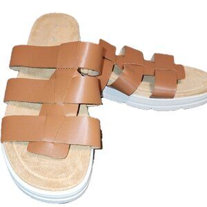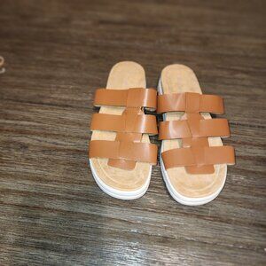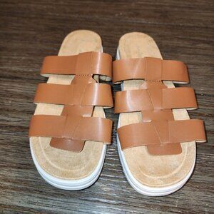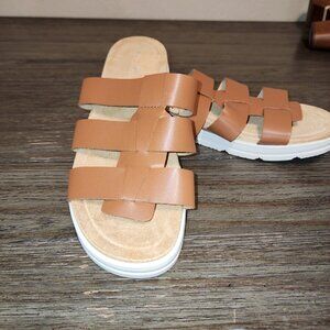 Stylish Easy Spirit sandals. Features tan straps. Comfortable and chic design.