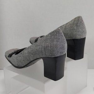 Elevate your style with these chic black leather block heels by Easy Spirit®. Featuring a stylish herringbone pattern in a wool blend upper material, these heels are a unique addition to any wardrobe. With a square toe shape and a comfortable heel style, these pumps are perfect for any occasion. The UK shoe size is 3.5 and the AU shoe size is 4.5. These heels are perfect for women who want to look and feel their best.