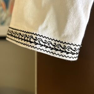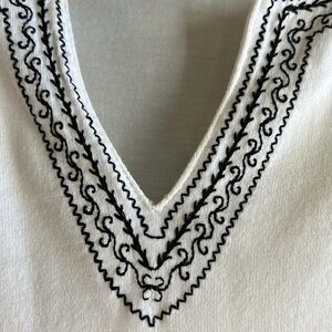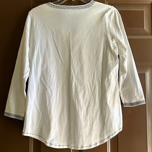 Easy Spirit Women’s (M) White Embroidered Tunic Blouse 3/4 Sleeve Boho Shirt. Black details around neck, cuffs and hem. 100% Cotton