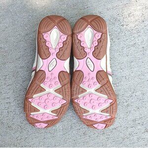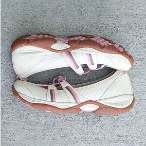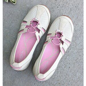 Comfortable Easy Spirit sneakers. Cream upper with pink accents. Durable brown sole. Perfect for casual wear.