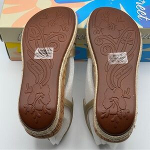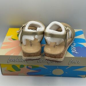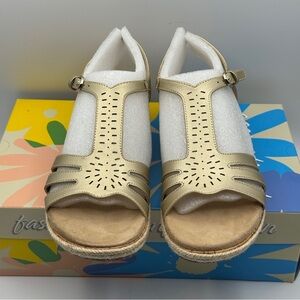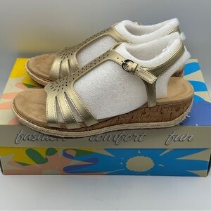 Easy Street “Dorinda” wedge sandals in metallic gold. T-strap style with laser-cut detailing, cork midsole, and cushioned footbed. Adjustable ankle strap. Size 6M. Brand new in box.