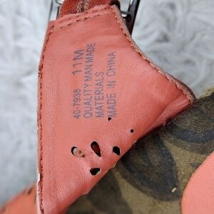 Easy Street Women's Tangerine Orange Faux Leather Floral Cut Out Upper Open Round Toe Wedged-Heel Three Eyelet Buckled Strap Slingback Espadrille Sandal Shoes. Rubber Sole. Faux Suede Footbed. Upper Creasing Per Photo. Light Footbed Wear. Light Sole Marks. Measurement approx. Heel: 2.5". Size 11 M. Color May Vary Due To Lighting.