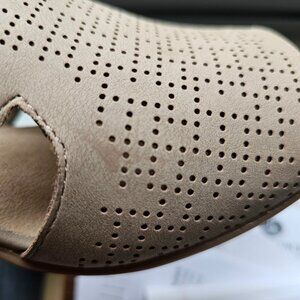 Easy Street sandals - Never worn, only tried on inside the house. Named Zelma size 8.5 M. Heel is approx 2 inches. I have too many shoes in a similar style, I need to downsize. The color is is called natural and looks tan on camera. In natural light, it looks taupe - see photos. There is a slight scuff and a mark on the right shoe - see photos. Feel free to ask questions or make an offer.