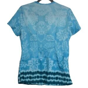 The beautiful blue floral pattern adds a touch of cheer to your workday. This top is designed for all-day comfort. It features a flattering fit and is made from a soft, breathable, and easy-to-care-for fabric blend.