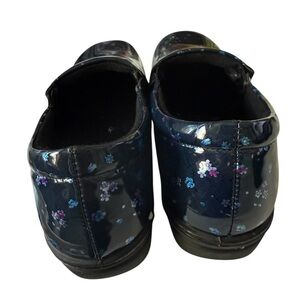Easy Works By Easy Street Slip Resistant Size 10 Wide Tiffany Slip on Clog. These shoes show no wear and appear to be new. They navy in coloe with small blue flowers.