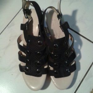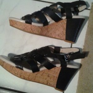 Easy spirit leather upper very cushiony wedges that are black and cork wedges with a cool design black top. They are size 6 and like new! Really great condition, almost new. I wore a couple times. They are sooo comfortable. I live in s. Fl though and i always wear flip flops!