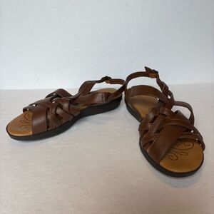 Step out in style with these elegant brown sandals. Perfect for any occasion, they offer both comfort and sophistication. Cushioned footbed. Rubber sole. Look new!