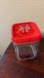 Heavy melamine style plastic clear container with reclosable red lid.