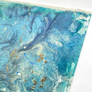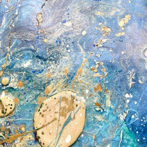 It is created on canvas with a vibrant turquoise, blue, pearl and gold acrylic paint base that is then covered with flowy liquid oil paints, then accented with resin "pearls", shimmery gold oil paint splashes and flashy mica chips.