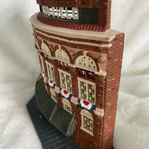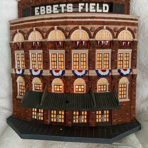 Dept 56 Ebbets Field model building. Features intricate brick design and colorful details. Original box is in ok condition but the building inside is in absolutely perfect condition! Lights up using a plug in bulb & cord (see pictures). Only thing missing is the small American flag from the awning. Approximate measurement is 11”x 11”. Ready to ship for baseball season..come & get it! Currently selling on Amazon for $299