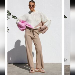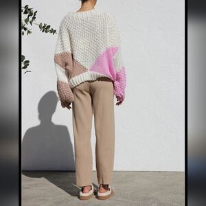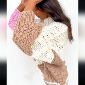 Stay cozy and stylish with this colorblock knit sweater. Featuring a blend of pink, cream, and tan, this sweater is perfect for any casual outing. Its soft fabric ensures comfort all day long.