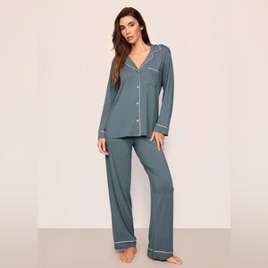 Soft blue pajama set with white piping. Long-sleeve top and matching pants. Comfortable and stylish. Reposhing. Sooooo soft and love the color. Just wasn’t my size unfortunately.