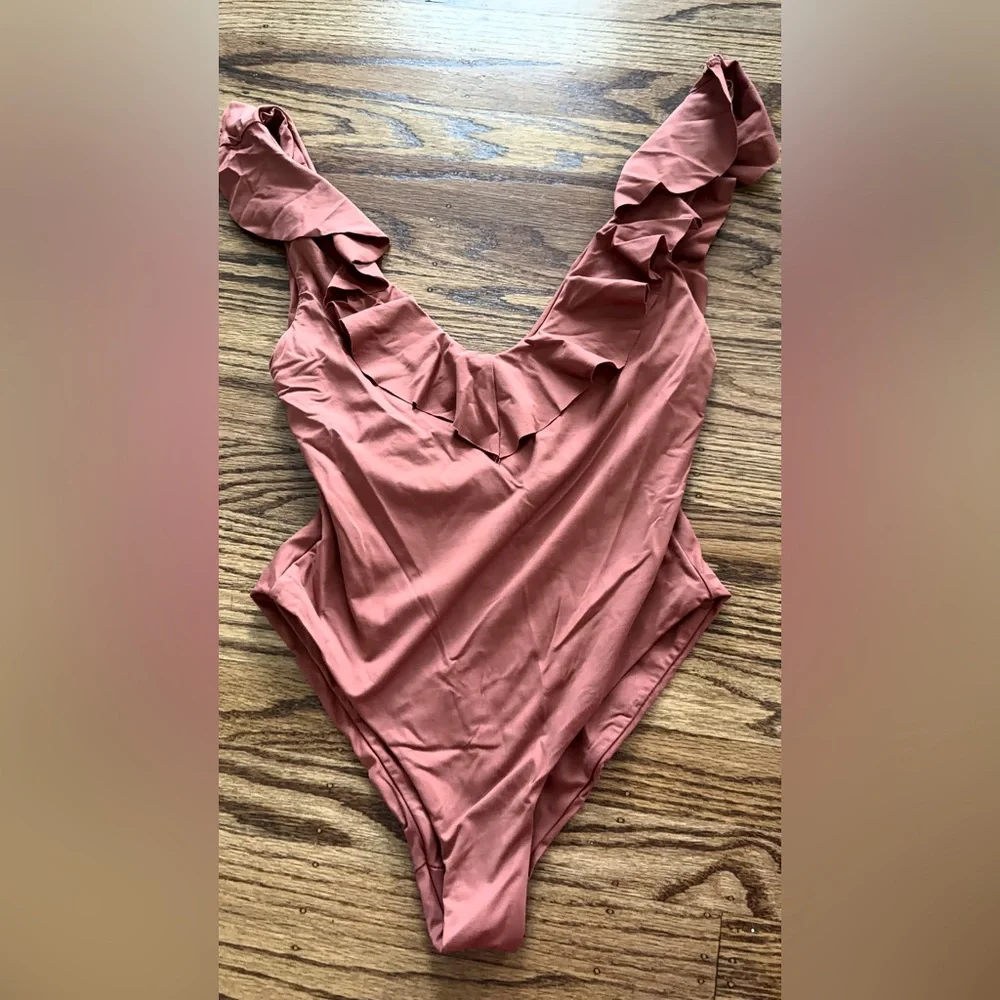 Eberjey light-rust colored ruffle one piece swimsuit. Size small, pink model photos shown for fit.