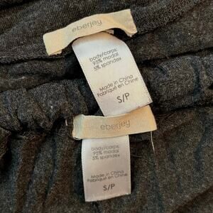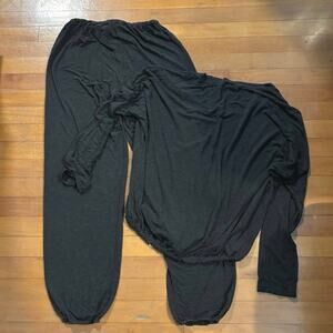 Eberjey ‘Gisele’ long pajama set. These are so incredibly soft. Modal blend. The color is a charcoal grey. Long sleeved top with drop shoulders. Ties at bottom hem. The pants have an elastic tie waist. Elastic at the ankles. Inseam is 30”. Both pieces are size Small. Light wash wear. Light discoloration on the waist tie (I tried to capture in the last picture).