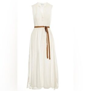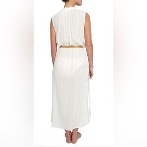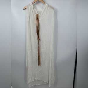 This airy, white sleeveless dress is one of our favorite beachwear pieces. Dress is sheer and comes with leather strap to tie at waist.