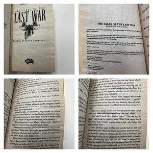 This is a paperback copy of Eberron : The Tales of the Last War edited by Mark Sehestedt. The book is a novel that takes place in the Eberron campaign setting in Dungeons and Dragons. The book is overall in Fair Condition with a bit of wear. The worst is the interior pages have some light waving in spots. Specifically pages 297 - 300 has some quite visible waving. The flyleaf and title page also has some much lighter waving, but the rest of the book is fine. There is also some yellowing to page edges and interior cover flaps. The sides visible with the pages pressed shut have some dark yellowing and a few minor marks. The side of the right front cover has a small tear, and the back has a small tear in similar spot on the back. The rest is edge wear marks and minor corner bends. All of these flaws are shown in the photos. Nothing catastrophic. The book is tightly bound, easily readable, with no interior stains, rips, tears, etc.. This comes from a smoke free and pet free home.