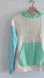 A custom made light cream colored base with a light green pastel hood and light blue sleeves. Oversized hood for comfort with cream string tips. Made with high quality french cotton terry.