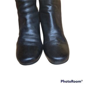 Black soft leather booties with inside,side zipper closure and a button detail. There is a very small knick in one of the heels. Please see photos for more details. In good pre-owned condition. Size 41.