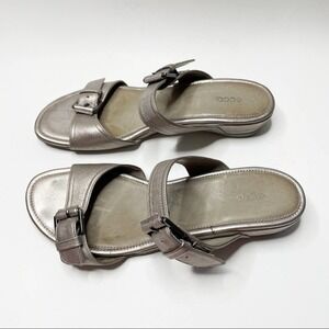 Perfect for summer Ecco champagne slides. Finished with a double buckle adjustable closure. Backless style.