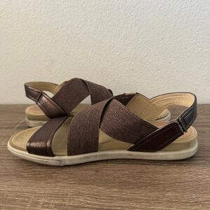 Criss-cross strap sandals from Ecco, with fabric style straps across the foot and a metallic leather strap across the toes. Size 8 and in great preowned condition; no visible flaws.