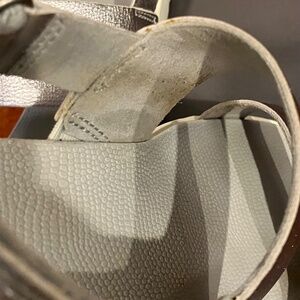 Ecco Freja sandal in beautiful metallic silver and white sole. Very comfortable shoes with adjustable hook / loop closure at heel. These are women's EU size 37 and US 6. Have been lightly worn but well take care of and stored in shoe box during off season. Clean and ready for the next wearer! Some wear to the inside straps and shoe sole as seen in close up photos. Box has shelf wear and is not labeled as the correct size of these shoes. Please review all photos for exact details, they are included as part of the description. Smoke free home, feel free to ask any questions. Thanks!