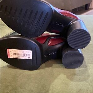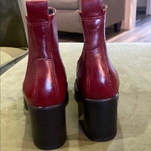 These Ecco ankle boots in a striking red color feature elastic side panels for easy slip-on wear and a chunky, medium-height heel. The smooth leather finish and slightly squared-off toe box add a modern touch to this classic design, making them a standout addition to any outfit.New without box .