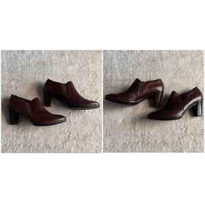 Excellent used condition. Shape 55 Plateau Shootie by Ecco in Coffee Cafe, a chocolate brown shade. Sophisticated, chic meets comfort aesthetic, a versatile capsule wardrobe shoe that can be dressed up or worn casually. Supportive ankle boot bootie with round toe, anatomically molded shank and footbed with premium sock lining, and stacked block heel. Textured snake reptile embossed leather upper with elastic side goring for easy on/off, see video. Note: light wear with minor surface scuffing at heel and sticker residue to bottom sole, see photos. Size 11, see photos for measurements.