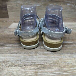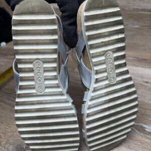 Stylish Ecco sandals with strappy design. Silver color with stud accents. Comfortable and chic.