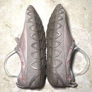 These Ecco slip-on shoes combine a suede and leather upper with a versatile gray tone and contrasting orange details, offering both style and comfort.