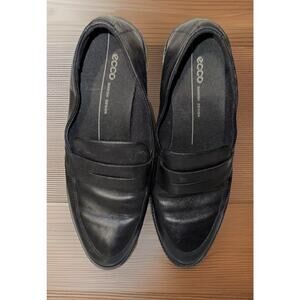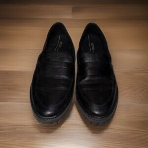 Ecco Women’s Modtray Black Leather Penny Loafers Chunky Lugged Rubber US 7-7.5