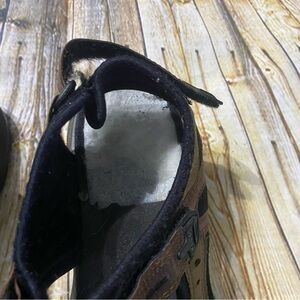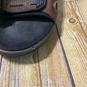 Ecco Yucatan Outdoor Hiking Sandals Brown Leather Womens Size EU41 10.5 in used condition. The heel has the footbed missing and there is a piece missing at the toe of the shoe. See pictures. No other stains, tears or rips.