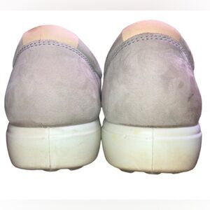 This is a very gently worn pair of Ecco brand, supple Nubuck (leather/suede) women’s sneakers. They are a taupe-ish gray color.