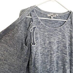 A blue and white knit top set with a short sleeved top and a cardigen. Made of linen, viscose, nylon, and cotton. Labeled a women's size medium.