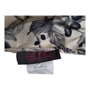 Chic silk scarf with black floral design. Cream background enhances elegance.