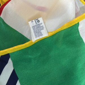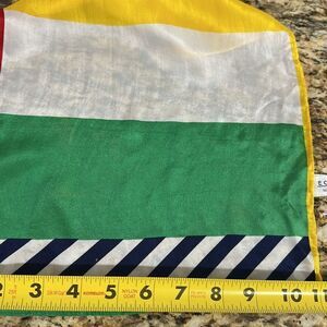 Elevate your style with this vibrant silk scarf. Featuring bold colors like red, yellow, green, and white, it's perfect for adding a pop of color to any outfit. The striped design adds a touch of elegance