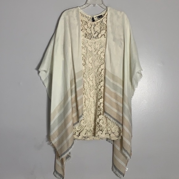 Brand Echo Ombré Cream Stripe Fray Edge Open Poncho Style Shawl 100% acrylic Preloved Good Condition Echo Tag is detached on one end Small thread imperfection, see close up Approx length 32” There is no measurement across chest Bc the Shawl is open Approx width 44” 1675C