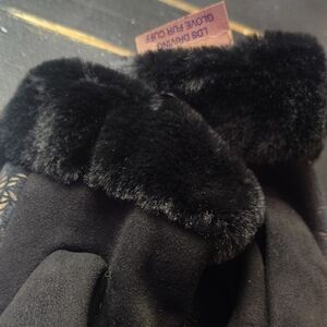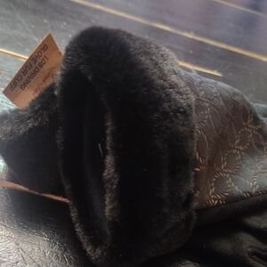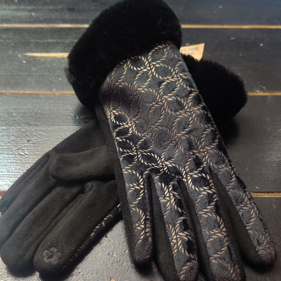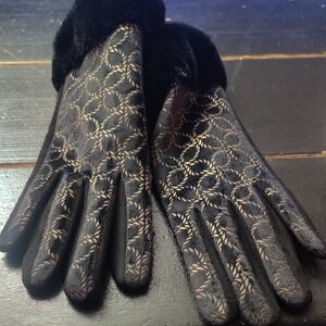 Stylish gloves with intricate gold pattern. Soft black material. Perfect for elegance.