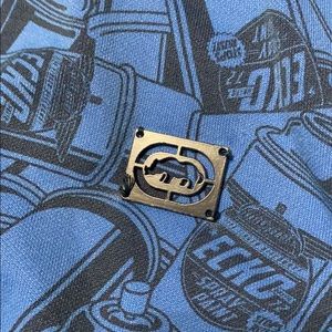 Blue jacket with spray cans that say echo and small black echo in top corner