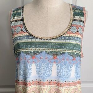 'Sofia' Sleeveless. Scoop neckline. Soft, lightweight fabric with stretch. Multicolor print. Semi-fitted. Slips on over head.
