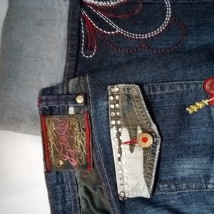 Echo Red capri jeans with red and silver embroidery. Like new. Clean and in Great condition. Folded cuff.