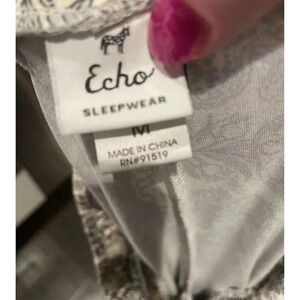 Keywords: Echo Sleepwear, lounge pants, women's pants, floral pants, gray pants, comfortable pants, elastic waist, casual wear, cozy nights, soft fabric, polyester, spandex, medium size, new condition.