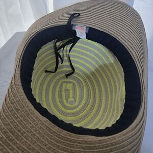 Nice bright sun hat with floppy brim and neon yellow weaving along with tan and white. A nice piece made from paper. Order it today ♥️