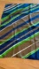 Elegant silk scarf with vibrant green, blue, and brown stripes. Perfect for adding a pop of color to any outfit.