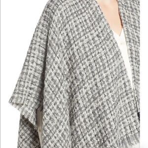 Coloring outside the lines in both fit and fabrication, this fringed ruana is crafted with a metallic-flecked tweed texture and a high/low hem for a different coverage option.