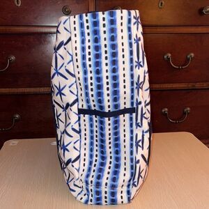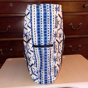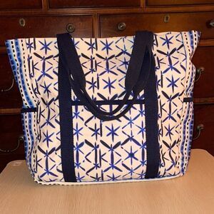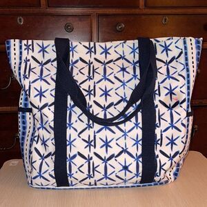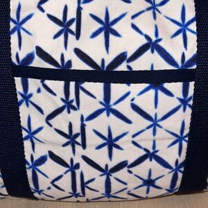 Echo navy and white patterned midweight canvas tote bag. Inside one zippered and one open pocket. Two outside side pockets and one front pocket between the handles. Snap close at top. Only flaw is the pink mark on the back side of the bag. Shown in last photo. Other excellent condition and no rips stains or tears.