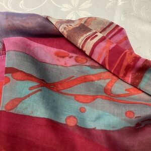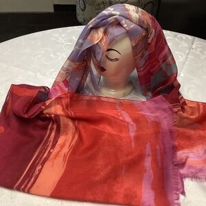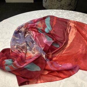 Beautiful scarf multicolor multi uses. This is very very long. You can use it even as a pool rep. It is by echo it measures approximately 72 inches long and the width of it to where it is a shawl is approximately 25 inches this has been stored absolutely lovely. No smoke no pet home.
