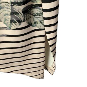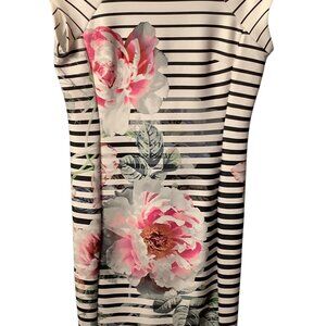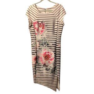 A sophisticated dress that combines classic nautical stripes with romantic floral elements, creating a versatile piece for professional and social settings. The asymmetrical hemline adds modern edge to the traditional print, while the soft color palette ensures elegant wearability.