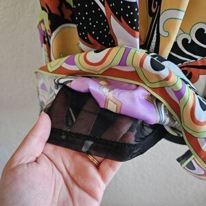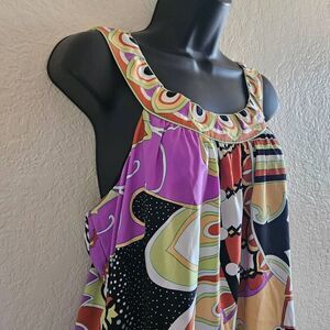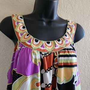 This vibrant sleeveless blouse by ECI features a bold, abstract print in a kaleidoscope of colors including lavender, lime green, orange, black, and white. The lightweight, flowy fabric is cut in an A-line silhouette, offering a relaxed and breezy fit that’s perfect for warm weather. It has a wide, scooped neckline with subtle pleating for added dimension, and the same colorful border print along the hem and neckline adds a polished, cohesive touch.